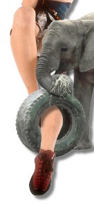 the presence of the elephant, its trunk, or the tire dangling from it.